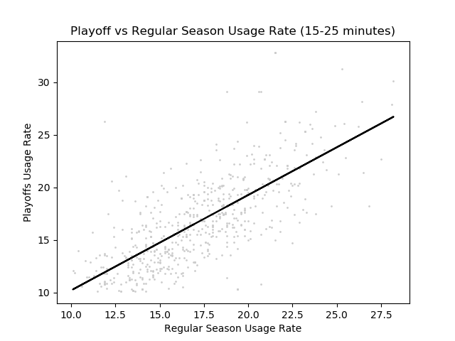 When we look at games in the playoffs, we see completely different strategies employed by teams. Star players seem to be more relied on than they would in the regular season, while players with smaller roles seem to be less useful than in the regular season. This ‘hunch’ can be represented with a graph of usage rates in the playoffs vs in the regular season. Here is a graph (with a line created with a basic linear regression algorithm).