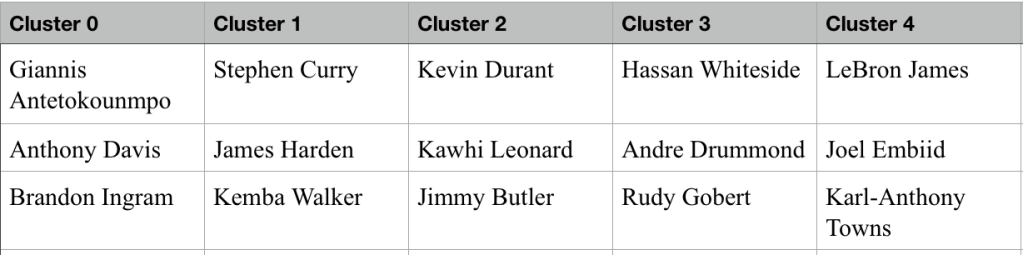 These are some of the notable players from each of the clusters. Interestingly, LeBron James and Joel Embiid are in the same cluster. Obviously they are not the same type of player, but their shooting tendencies are quite similar. This is why adding something like assist data could be beneficial to the performance of this model.